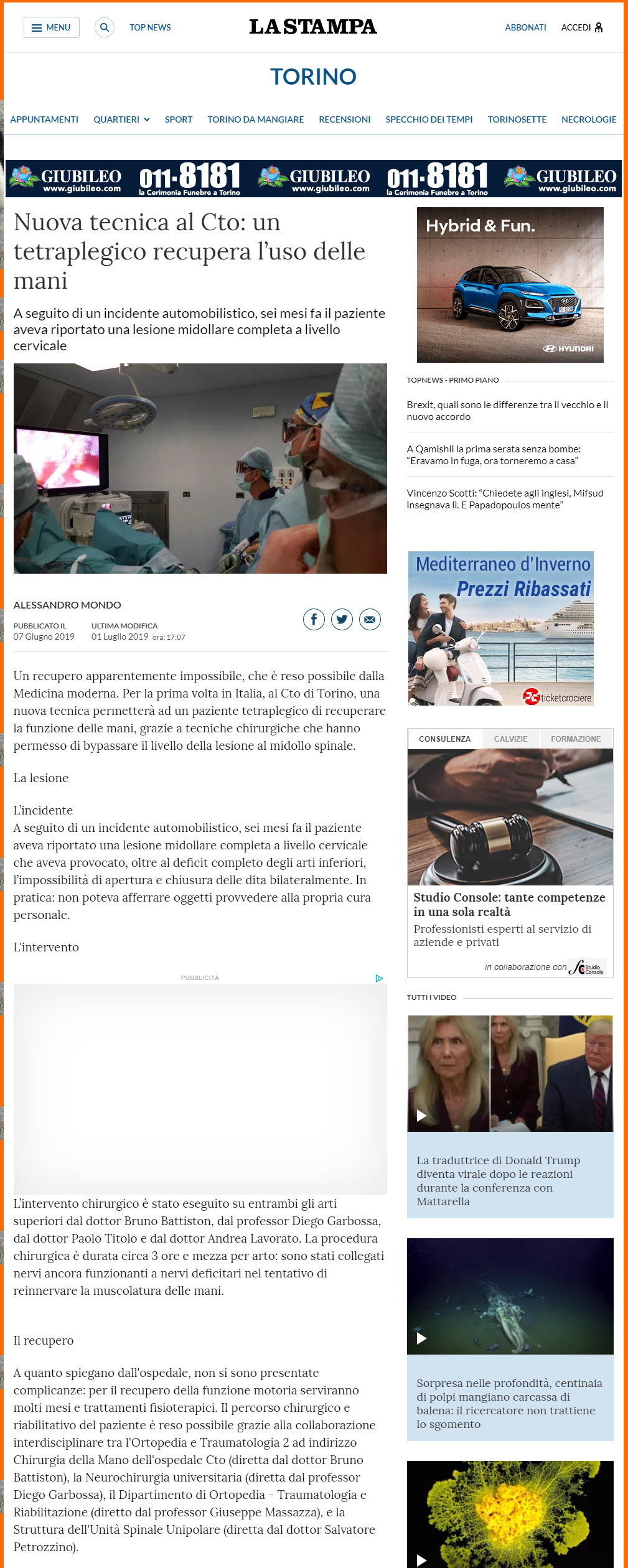 Tetraplegico ritrova uso delle mani “È il primo intervento di questo tipo”7 Giugno 2019Con intervento innovativo tetraplegico recupera funzione mani, prima volta in Italia7 Giugno 2019 https://www.lastampa.it/torino/2019/06/07/news/nuova-tecnica-al-cto-un-tetraplegico-recupera-l-uso-delle-mani-1.36539188?refresh_ce Share Articoli correlati5 Ottobre 2019Dita mani amputate, 11 ore per salvarleLeggi22 Agosto 2019Salve le braccia della donna aggredita da un pitbull martedì mattina a ValenzaLeggi22 Luglio 2019Ospedale Cto, salvata la mano di un uomo feritosi con una sega circolare: riattaccato l’artoLeggi